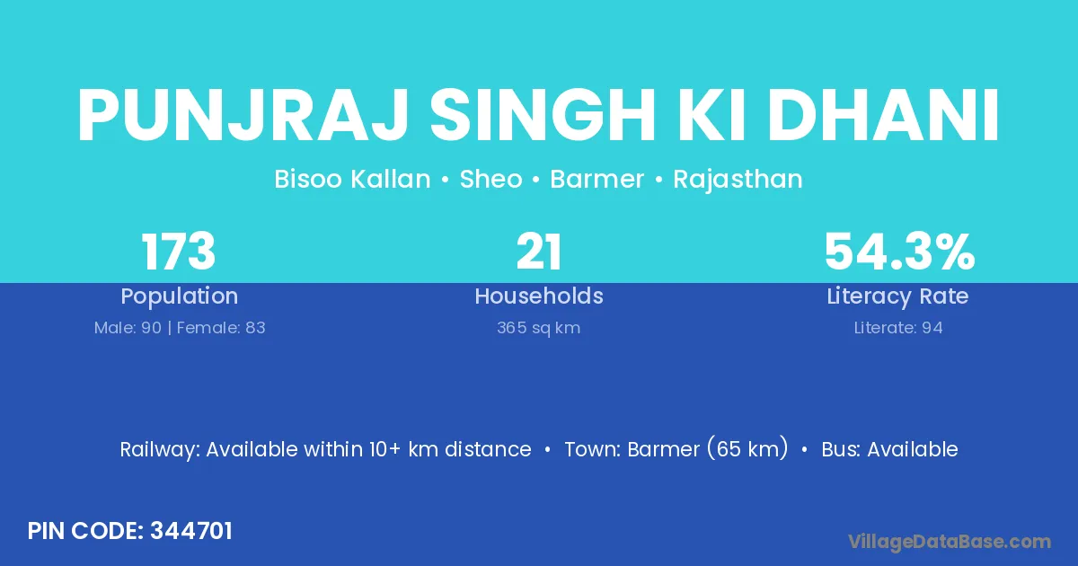 Punjraj Singh Ki Dhani village has a total population of 173 people, of which 90 are males and 83 are females.
