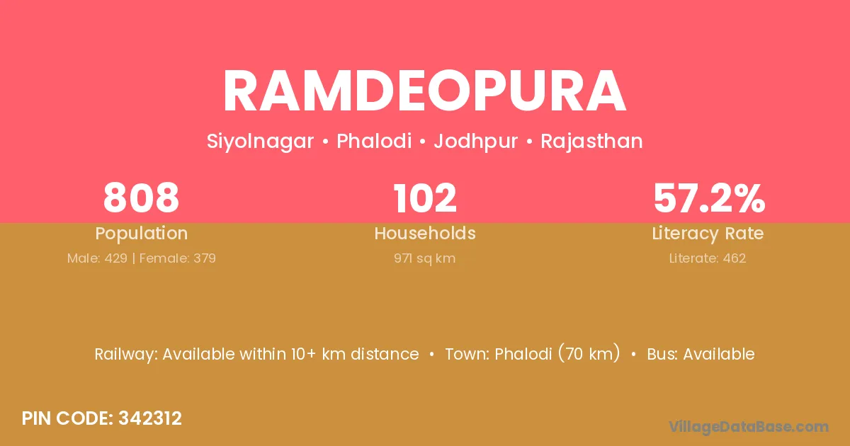 Barmer (109 km) is the nearest town to Ramdeopura village for major economic activities and is located approximately 109 km away.