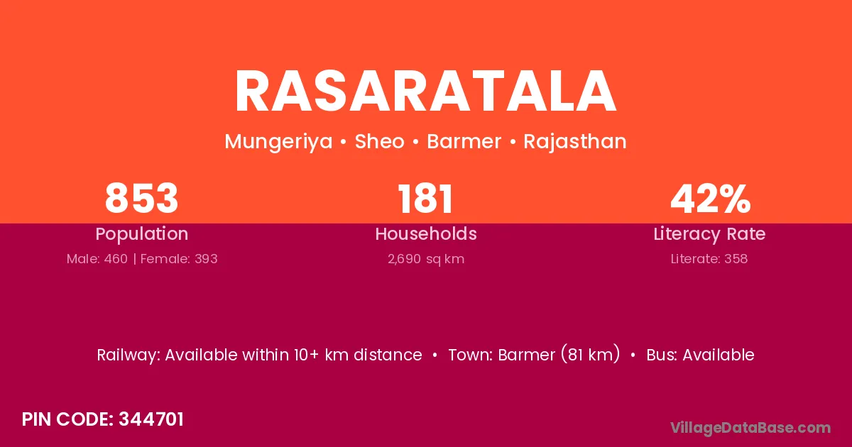 Barmer (81 km) is the nearest town to Rasaratala village for major economic activities and is located approximately 81 km away.