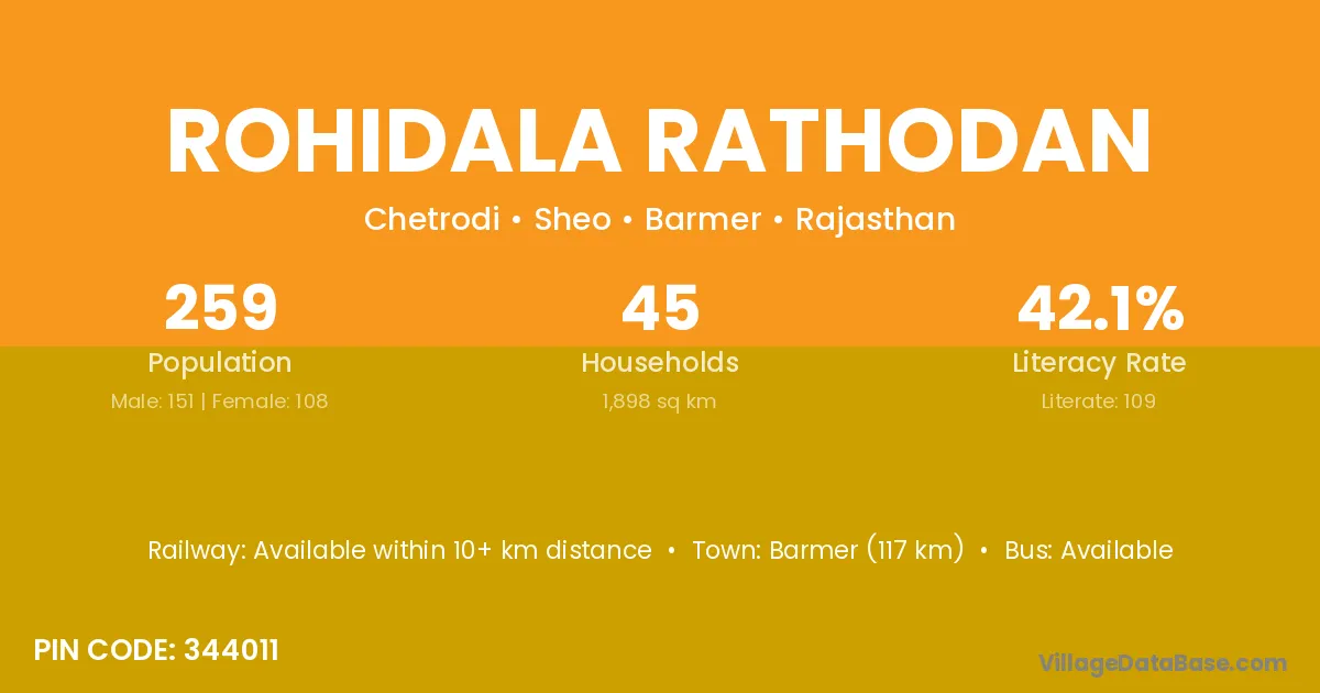 Barmer (117 km) is the nearest town to Rohidala Rathodan village for major economic activities and is located approximately 117 km away.