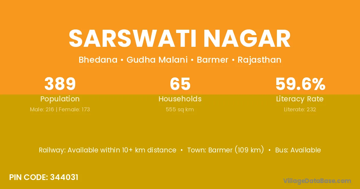 Barmer (77 km) is the nearest town to Sarswati Nagar village for major economic activities and is located approximately 77 km away.
