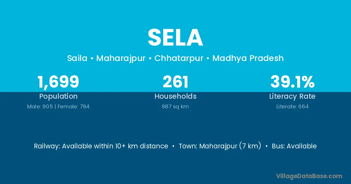 The literacy rate of Sela village is 39.74%. Male literacy stands at 52.33% and female literacy at 26.34%.