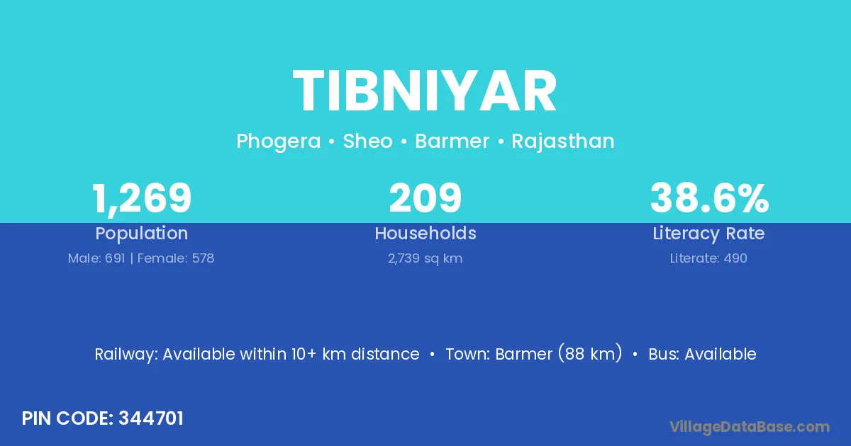 Barmer (88 km) is the nearest town to Tibniyar village for major economic activities and is located approximately 88 km away.