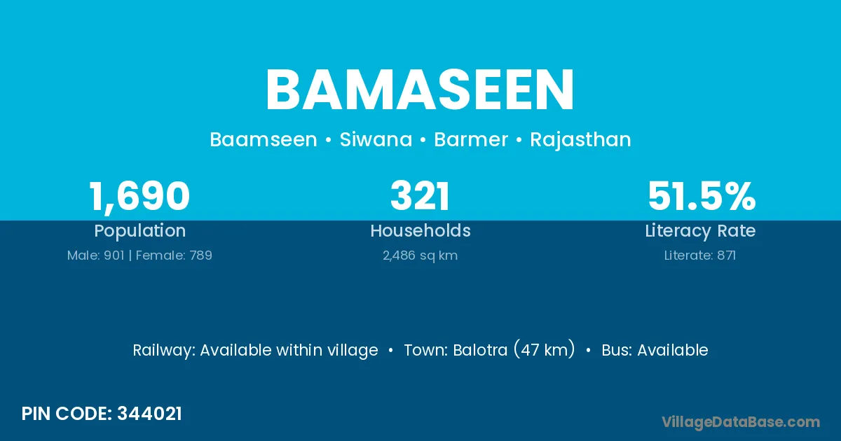Balotra (47 km) is the nearest town to Bamaseen village for major economic activities and is located approximately 47 km away.