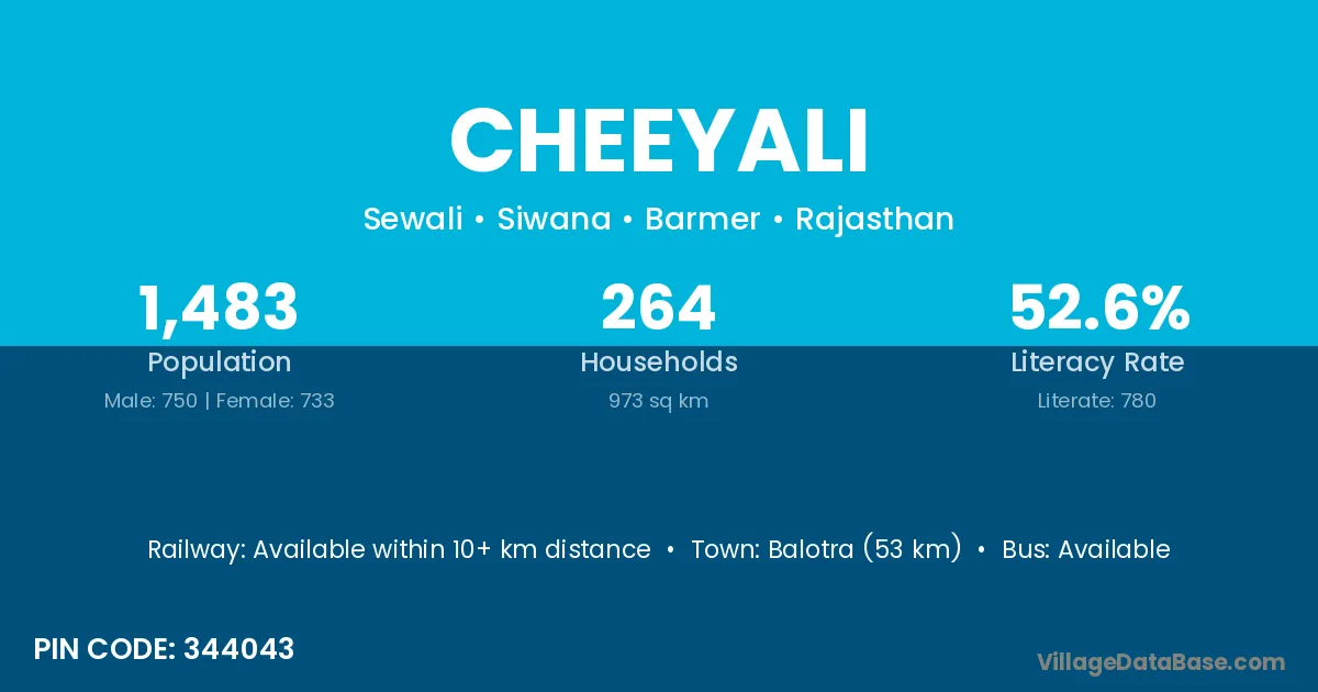 Balotra (53 km) is the nearest town to Cheeyali village for major economic activities and is located approximately 53 km away.