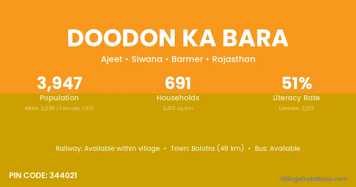 Doodon Ka Bara village has a total population of 3,947 people, of which 2,035 are males and 1,912 are females.