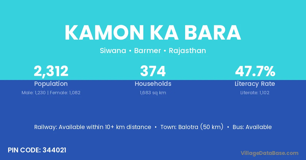 Balotra (50 km) is the nearest town to Kamon Ka Bara village for major economic activities and is located approximately 50 km away.