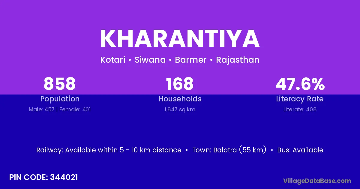 Balotra (55 km) is the nearest town to Kharantiya village for major economic activities and is located approximately 55 km away.