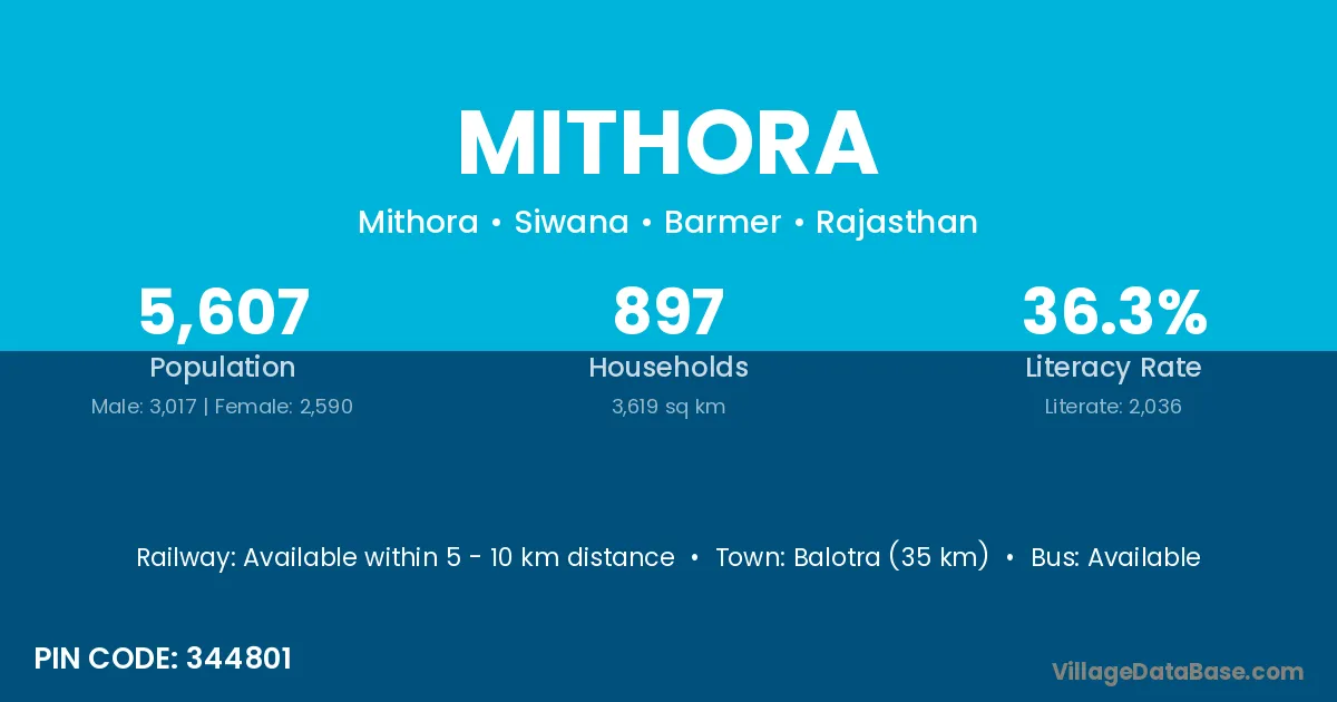 Balotra (35 km) is the nearest town to Mithora village for major economic activities and is located approximately 35 km away.