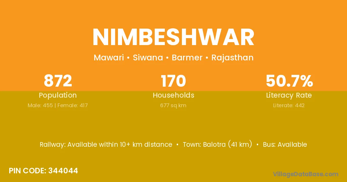 Balotra (41 km) is the nearest town to Nimbeshwar village for major economic activities and is located approximately 41 km away.