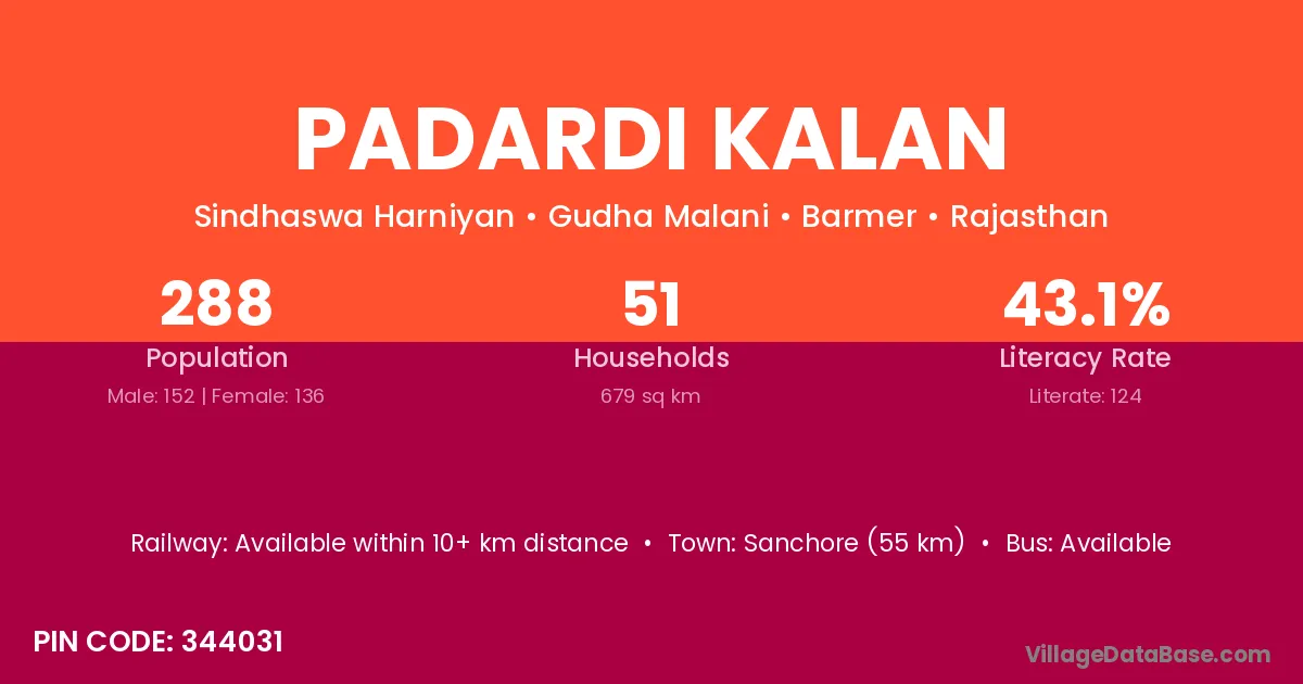 Balotra (34 km) is the nearest town to Padardi Kalan village for major economic activities and is located approximately 34 km away.