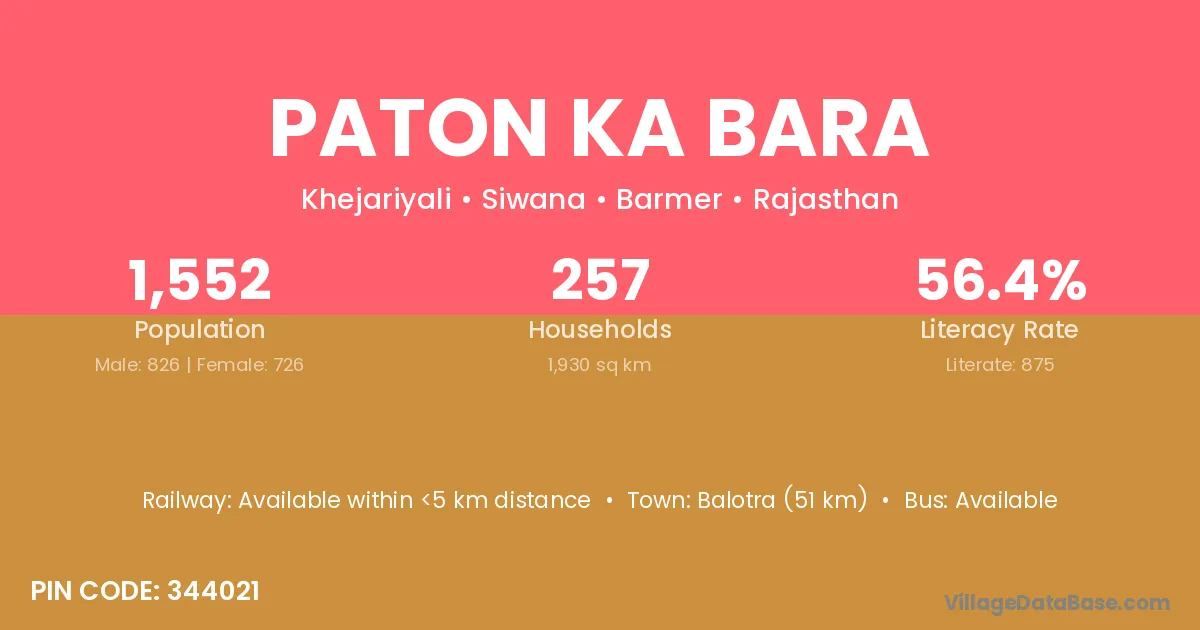 Balotra (51 km) is the nearest town to Paton Ka Bara village for major economic activities and is located approximately 51 km away.