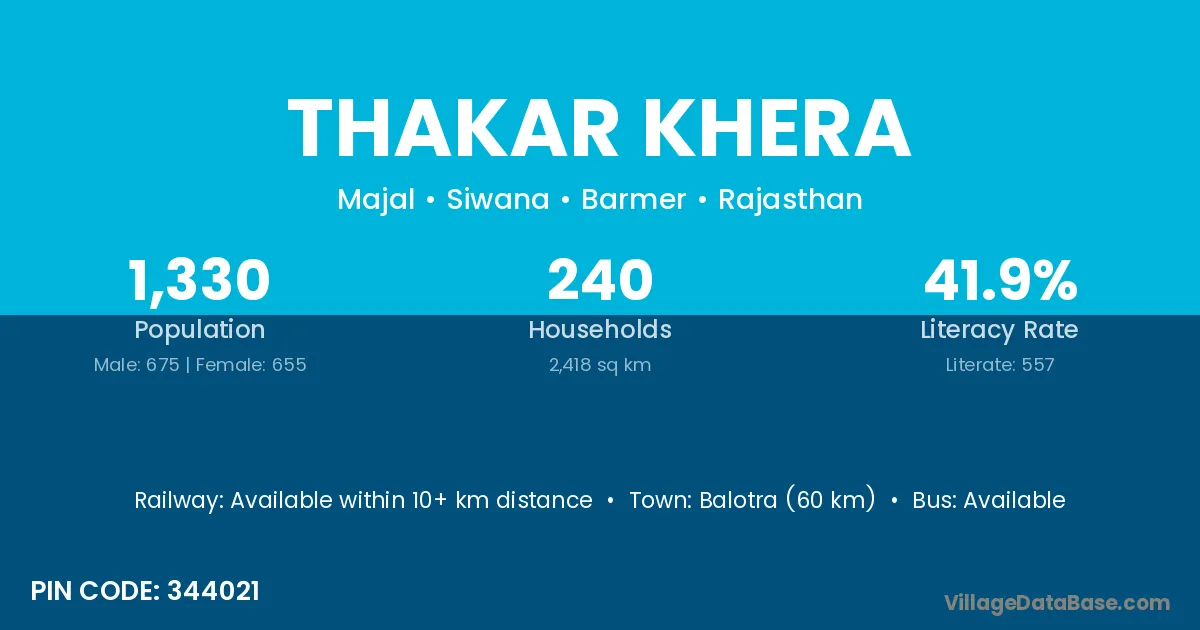 Balotra (60 km) is the nearest town to Thakar Khera village for major economic activities and is located approximately 60 km away.