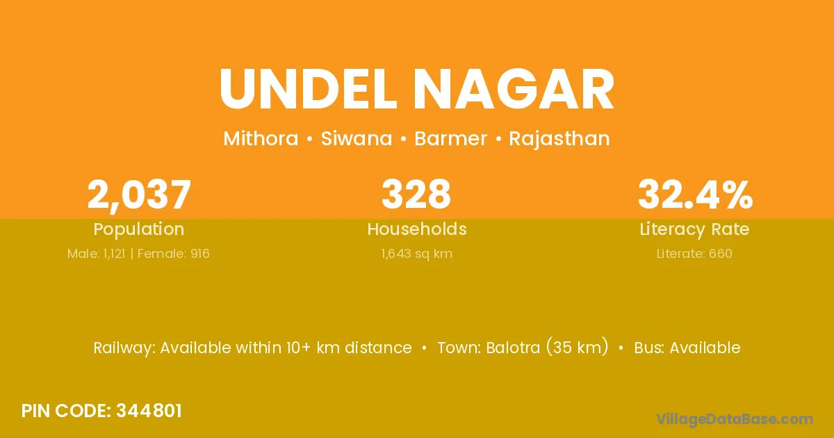 Balotra (35 km) is the nearest town to Undel Nagar village for major economic activities and is located approximately 35 km away.