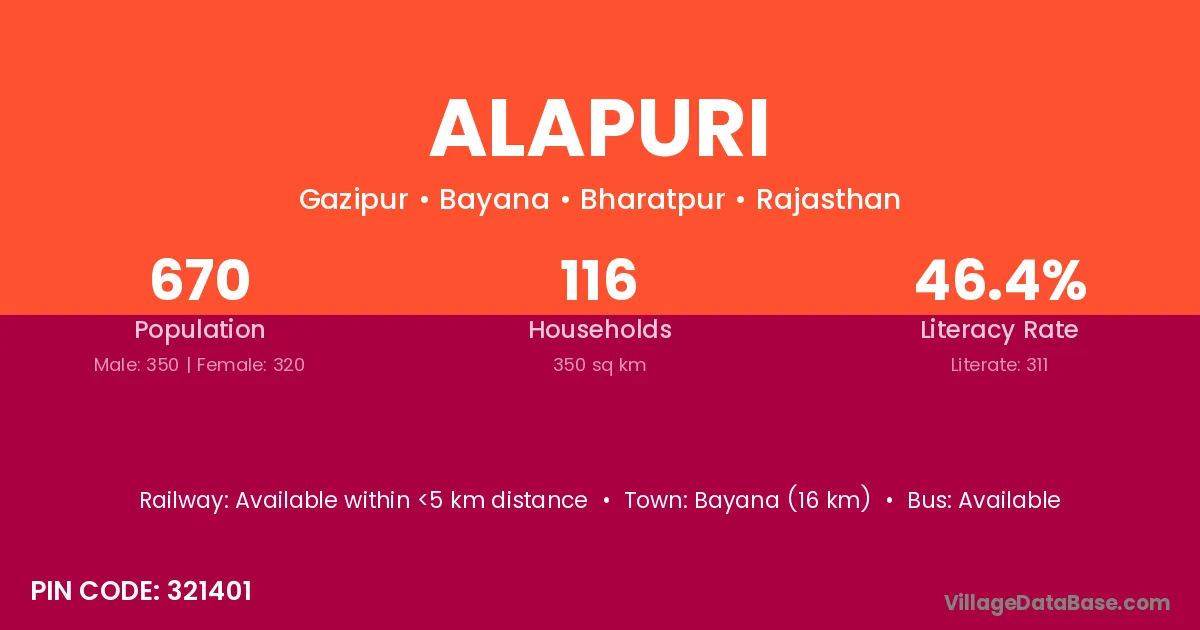 Bayana (16 km) is the nearest town to Alapuri village for major economic activities and is located approximately 16 km away.