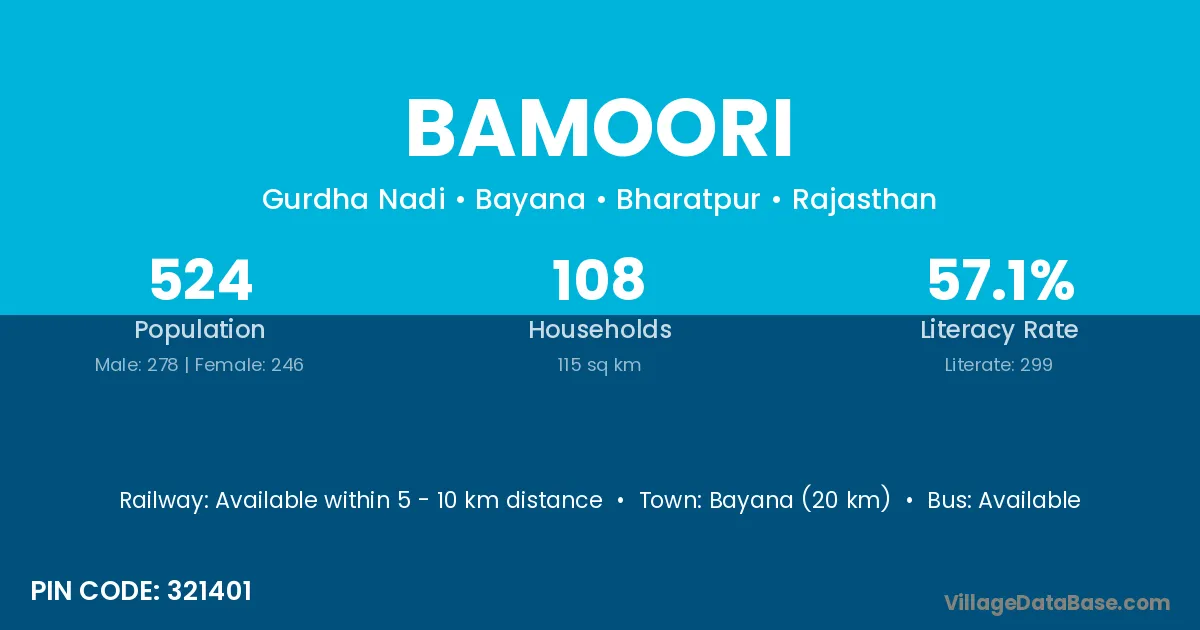 Bayana (20 km) is the nearest town to Bamoori village for major economic activities and is located approximately 20 km away.
