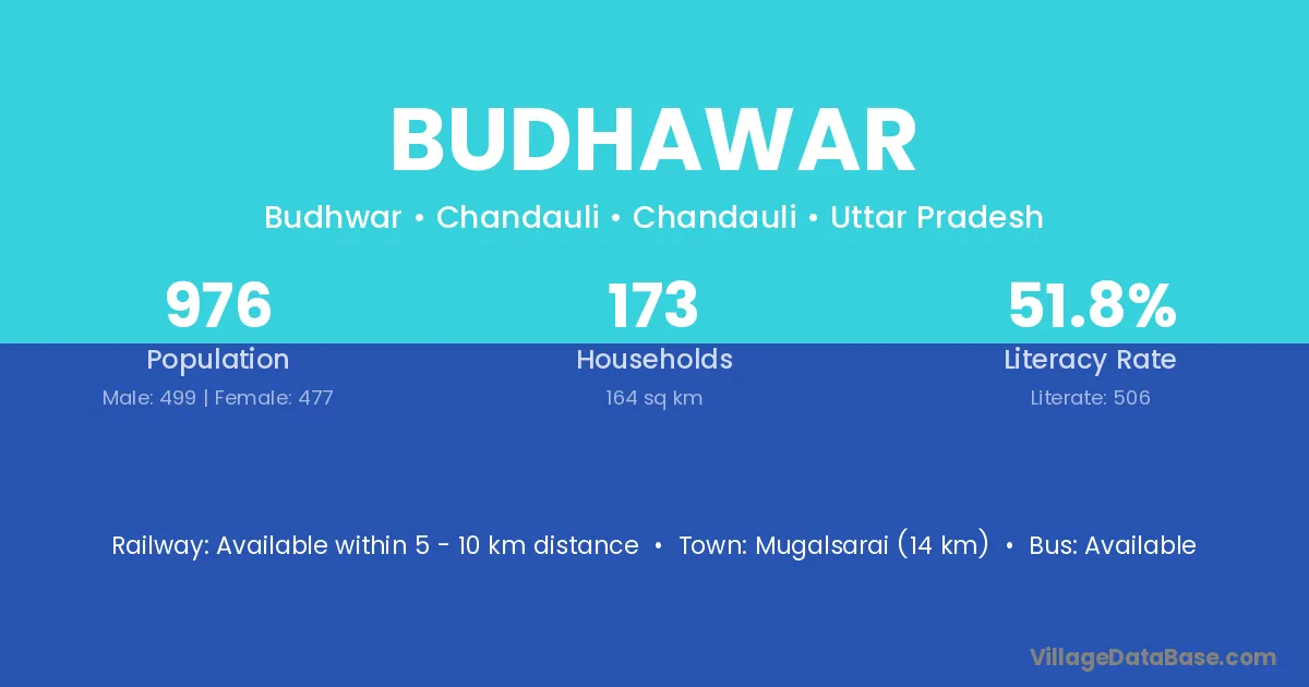 The literacy rate of Budhawar village is 47.78%. Male literacy stands at 64.86% and female literacy at 27.05%.