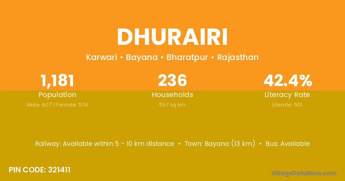 Bayana (13 km) is the nearest town to Dhurairi village for major economic activities and is located approximately 13 km away.