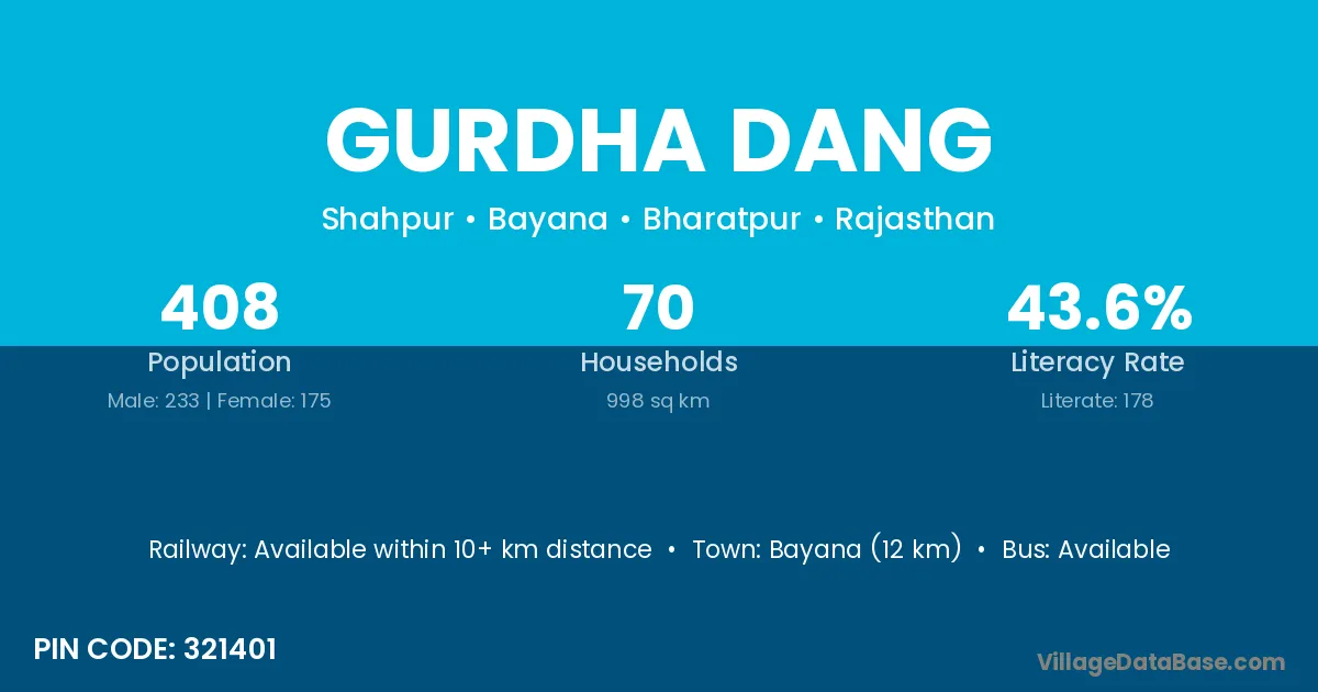 Bayana (12 km) is the nearest town to Gurdha Dang village for major economic activities and is located approximately 12 km away.