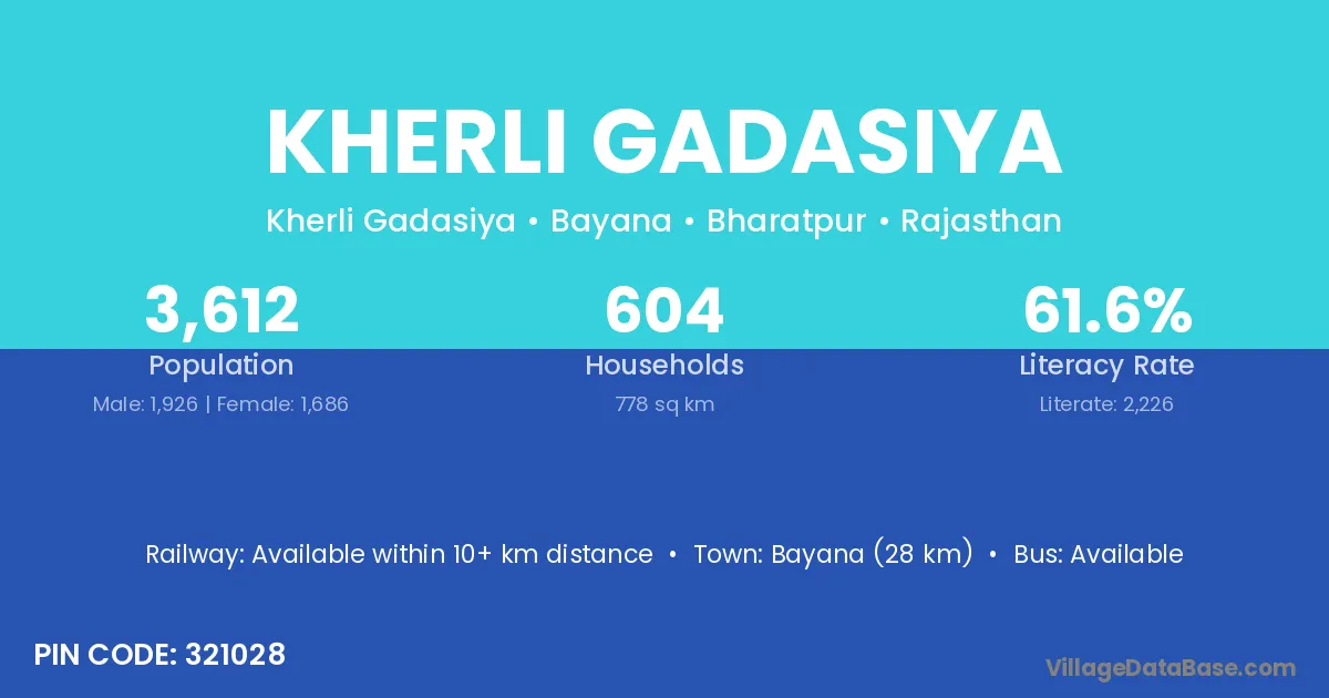 Bayana (28 km) is the nearest town to Kherli Gadasiya village for major economic activities and is located approximately 28 km away.