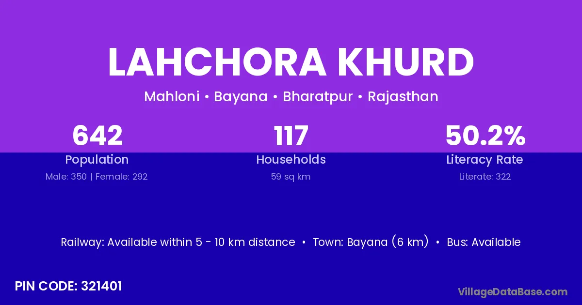Bayana (6 km) is the nearest town to Lahchora Khurd village for major economic activities and is located approximately 6 km away.
