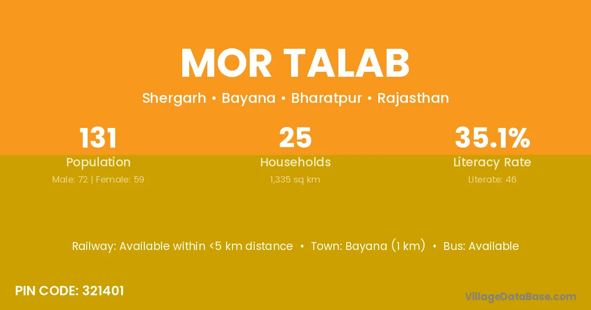 Bayana (1 km) is the nearest town to Mor Talab village for major economic activities and is located approximately 1 km away.