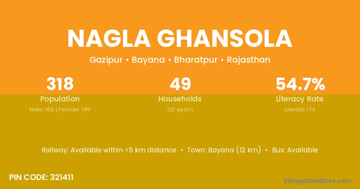 Bayana (12 km) is the nearest town to Nagla Ghansola village for major economic activities and is located approximately 12 km away.