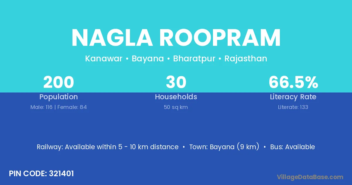 Bayana (9 km) is the nearest town to Nagla Roopram village for major economic activities and is located approximately 9 km away.