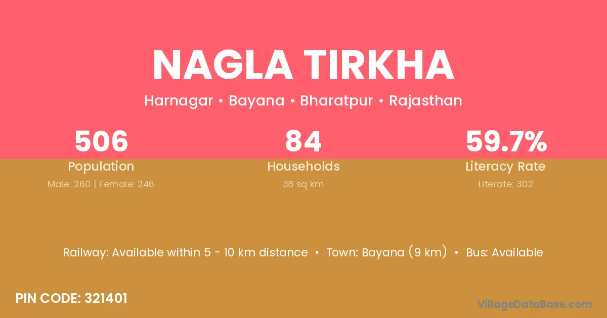 Nagla Tirkha village has a total population of 506 people, of which 260 are males and 246 are females.