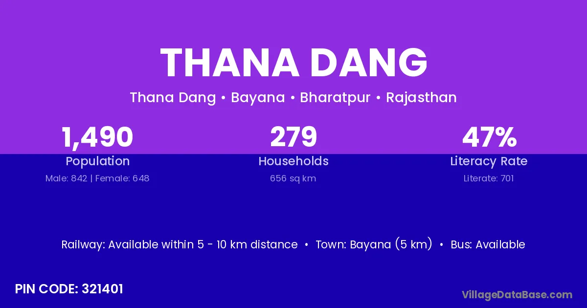 Bayana (5 km) is the nearest town to Thana Dang village for major economic activities and is located approximately 5 km away.