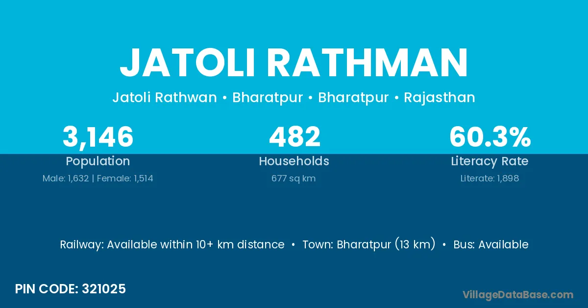 Bharatpur (13 km) is the nearest town to Jatoli Rathman village for major economic activities and is located approximately 13 km away.