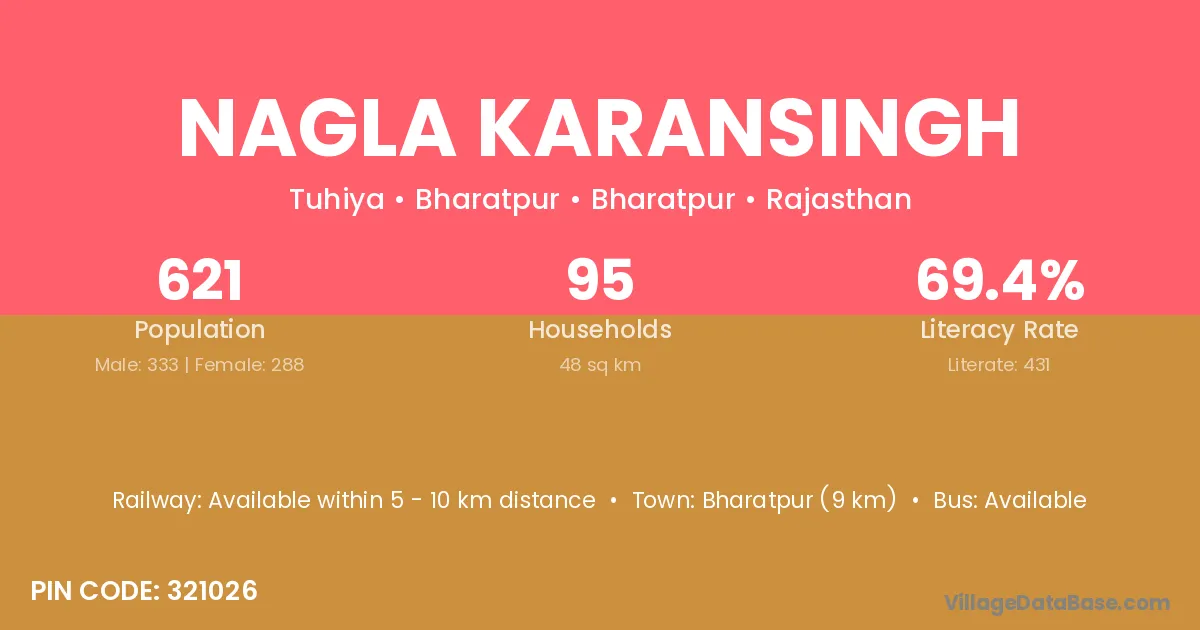 Bharatpur (9 km) is the nearest town to Nagla Karansingh village for major economic activities and is located approximately 9 km away.