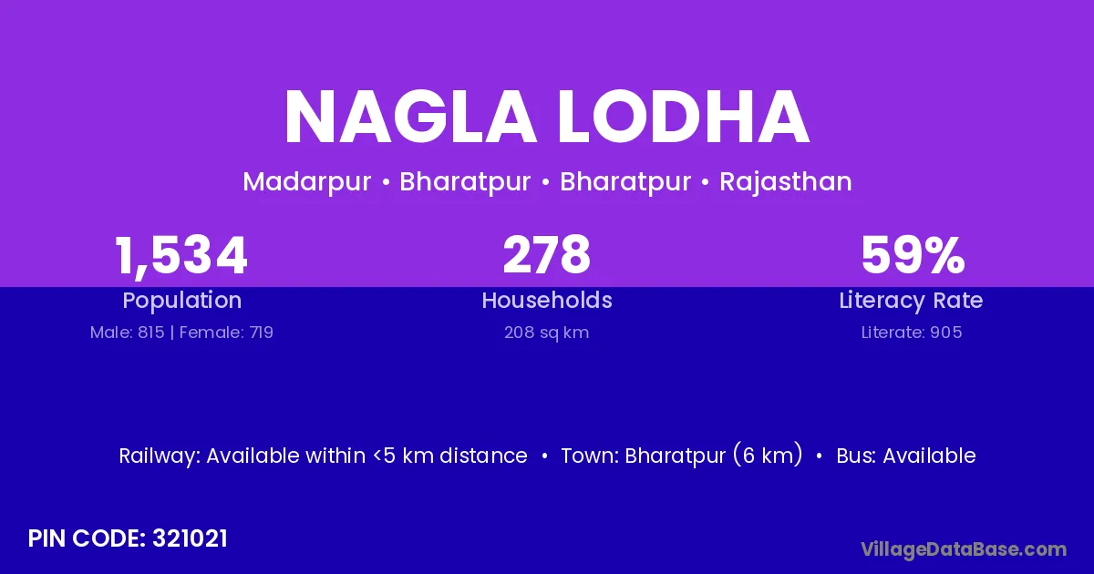 Bharatpur (6 km) is the nearest town to Nagla Lodha village for major economic activities and is located approximately 6 km away.