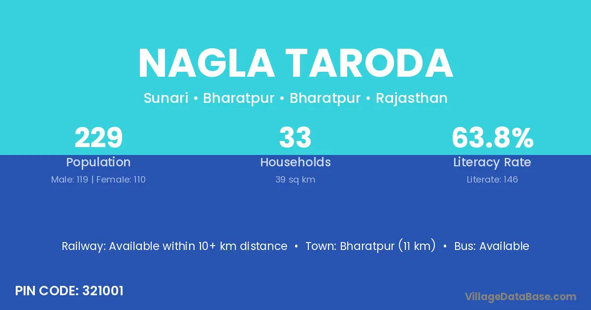 Bharatpur (11 km) is the nearest town to Nagla Taroda village for major economic activities and is located approximately 11 km away.