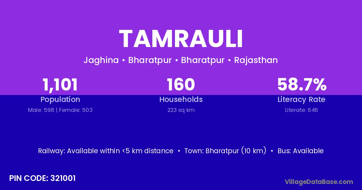 Tamrauli village has a total population of 1,101 people, of which 598 are males and 503 are females.