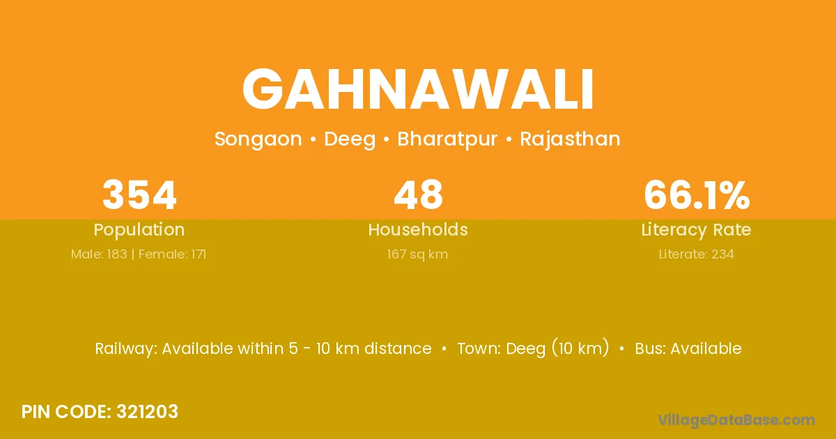 Deeg (10 km) is the nearest town to Gahnawali village for major economic activities and is located approximately 10 km away.