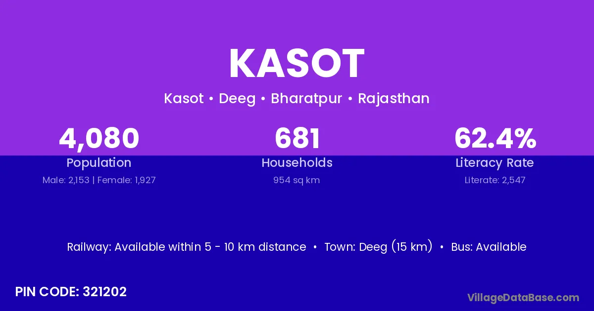 Deeg (15 km) is the nearest town to Kasot village for major economic activities and is located approximately 15 km away.