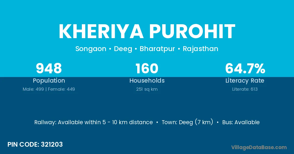 Deeg (7 km) is the nearest town to Kheriya Purohit village for major economic activities and is located approximately 7 km away.
