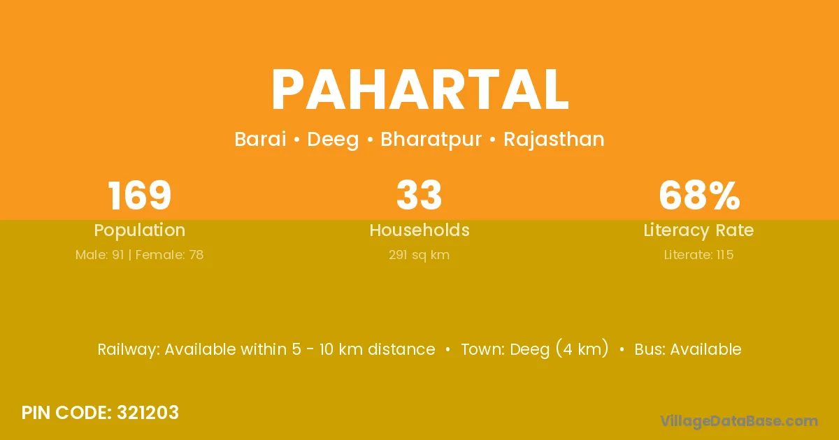 Deeg (4 km) is the nearest town to Pahartal village for major economic activities and is located approximately 4 km away.
