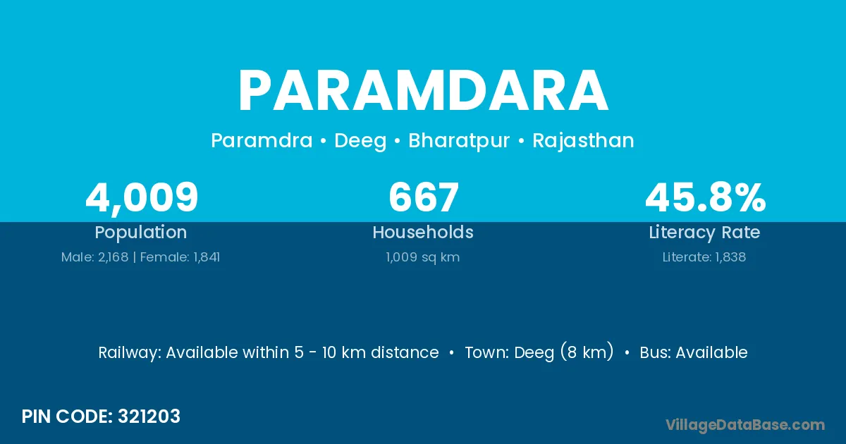 Deeg (8 km) is the nearest town to Paramdara village for major economic activities and is located approximately 8 km away.