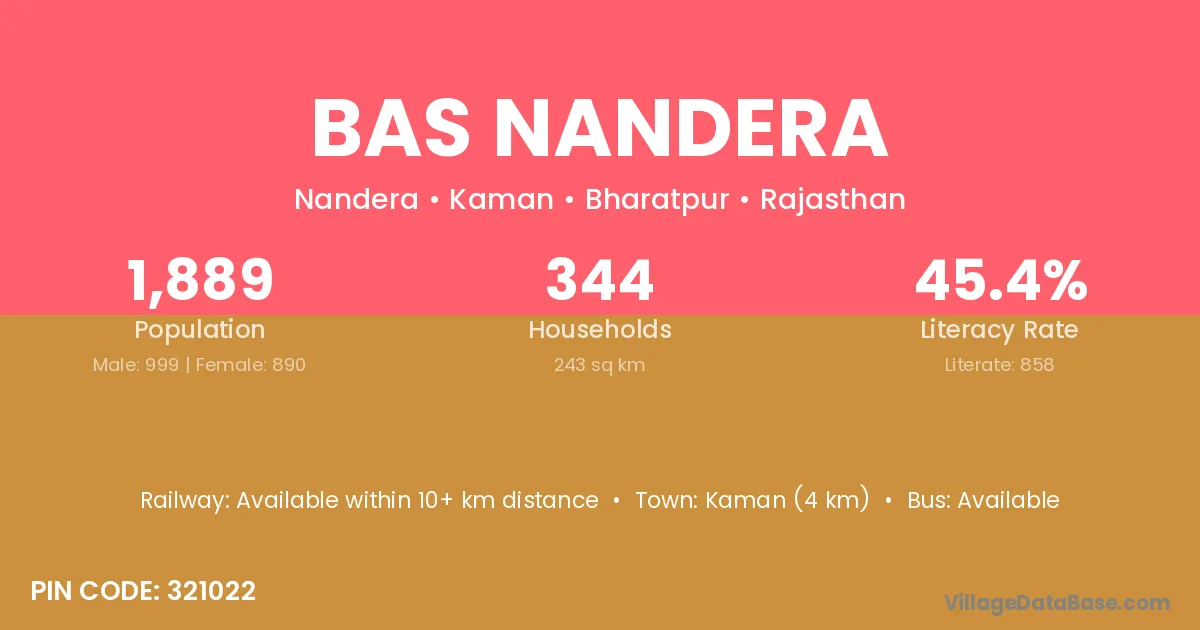 Kaman (4 km) is the nearest town to Bas Nandera village for major economic activities and is located approximately 4 km away.