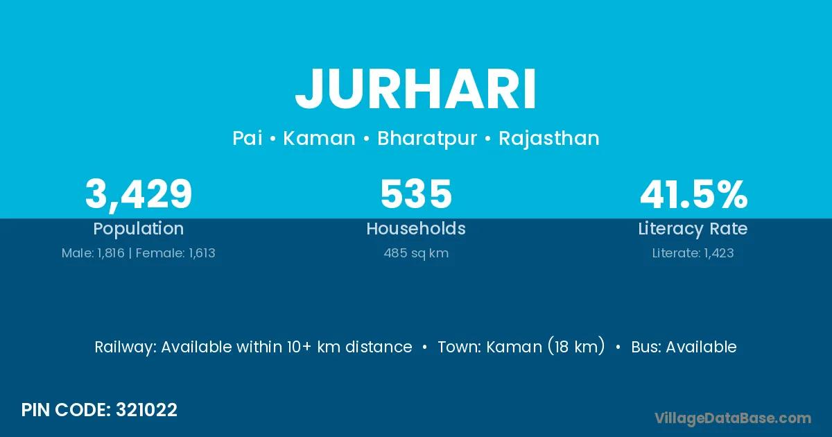 Kaman (18 km) is the nearest town to Jurhari village for major economic activities and is located approximately 18 km away.