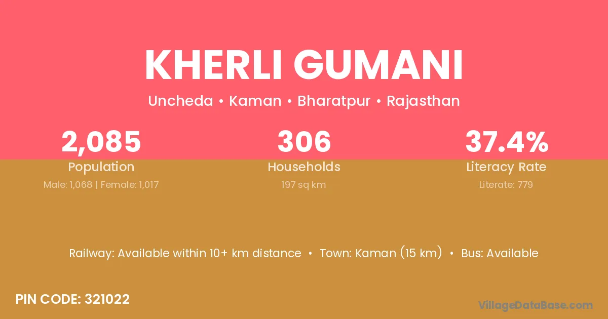 Kaman (15 km) is the nearest town to Kherli Gumani village for major economic activities and is located approximately 15 km away.