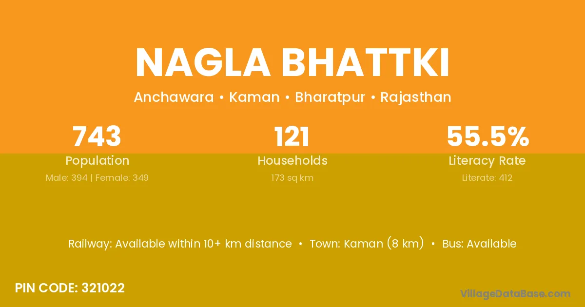 Kaman (8 km) is the nearest town to Nagla Bhattki village for major economic activities and is located approximately 8 km away.
