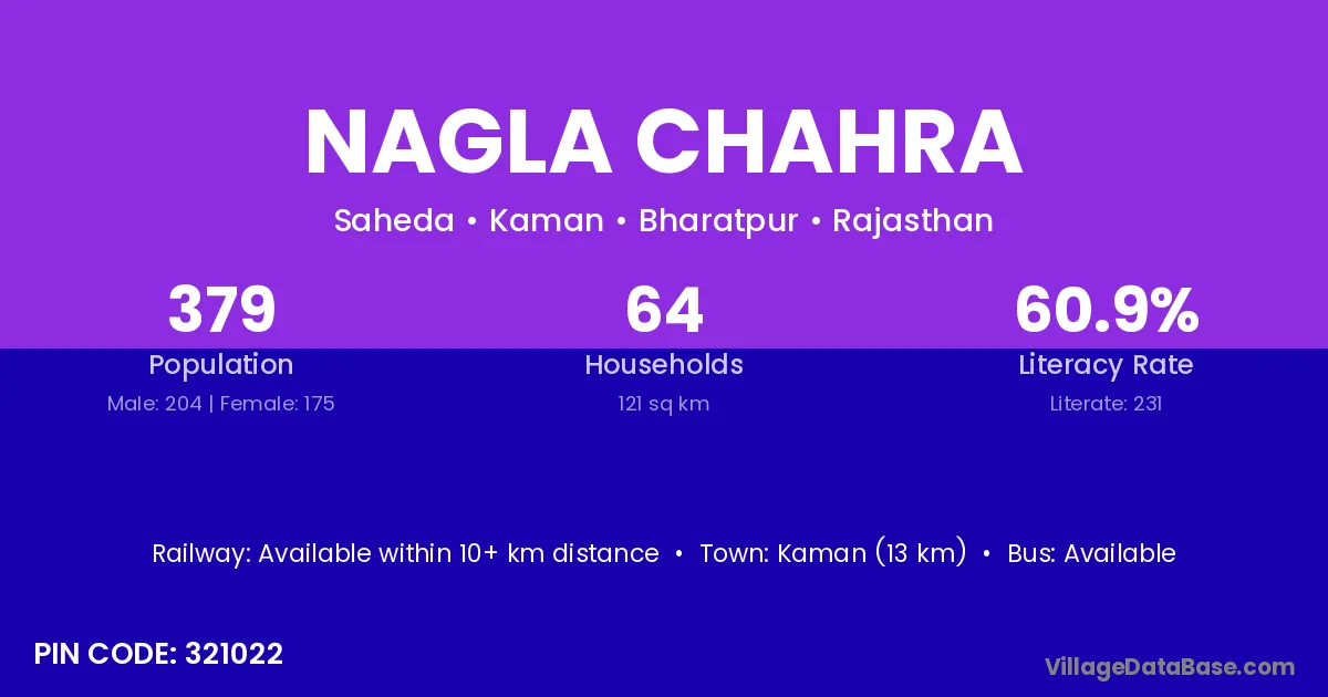 Kaman (13 km) is the nearest town to Nagla Chahra village for major economic activities and is located approximately 13 km away.