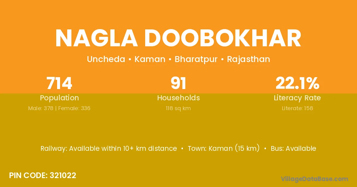 Kaman (15 km) is the nearest town to Nagla Doobokhar village for major economic activities and is located approximately 15 km away.