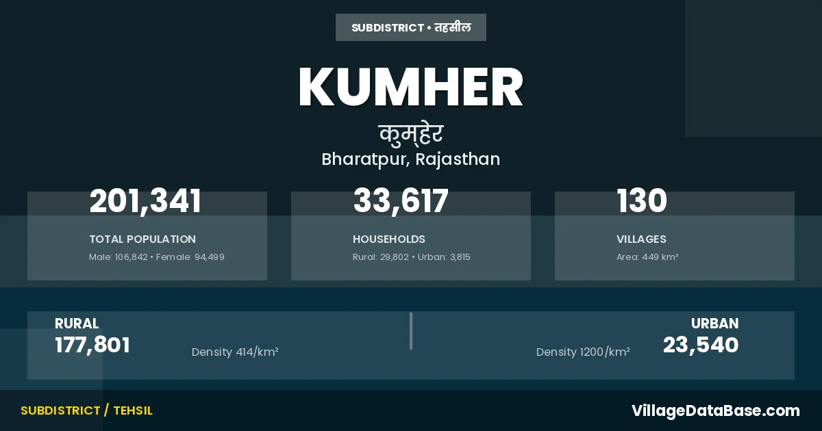 According to the 2011 census The total area of Kumher Tehsil is 449 km², with a population of 201341 people. The population density is 449 inhabitants per square kilometre, and there are approximately 33617 houses in the sub district.
