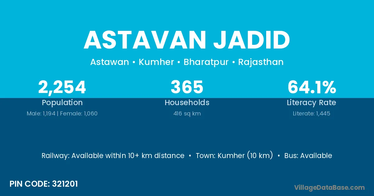 Kumher (10 km) is the nearest town to Astavan Jadid village for major economic activities and is located approximately 10 km away.
