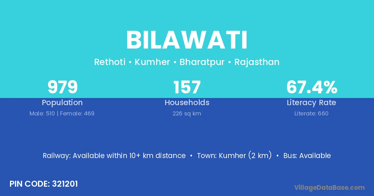 Kumher (2 km) is the nearest town to Bilawati village for major economic activities and is located approximately 2 km away.