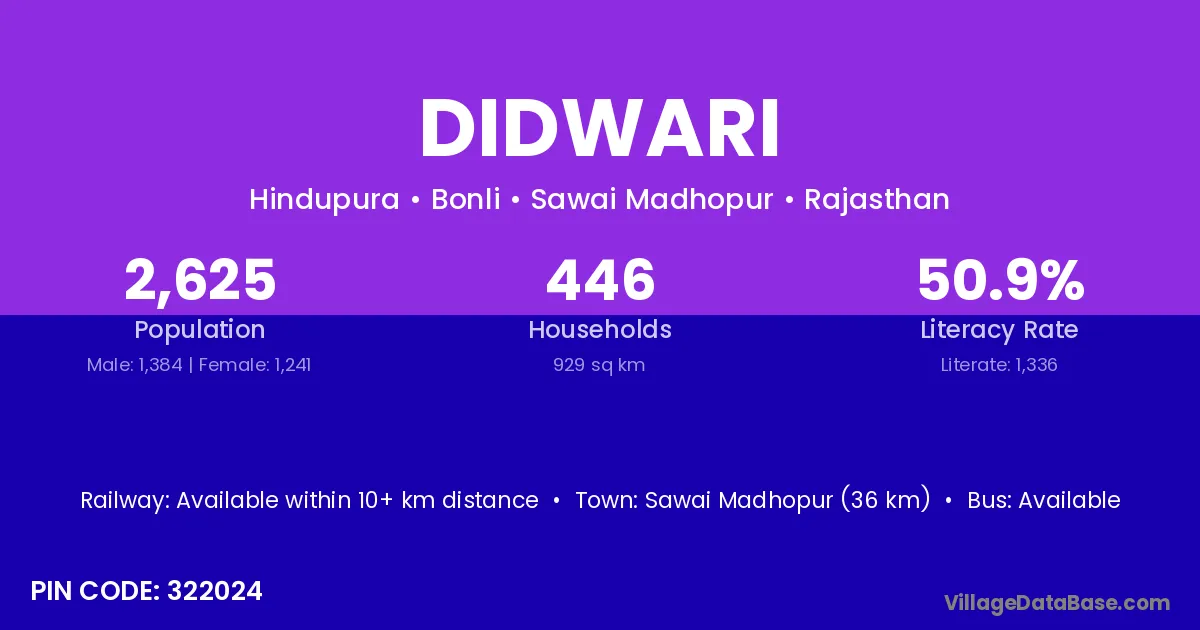 Kumher (15 km) is the nearest town to Didwari village for major economic activities and is located approximately 15 km away.